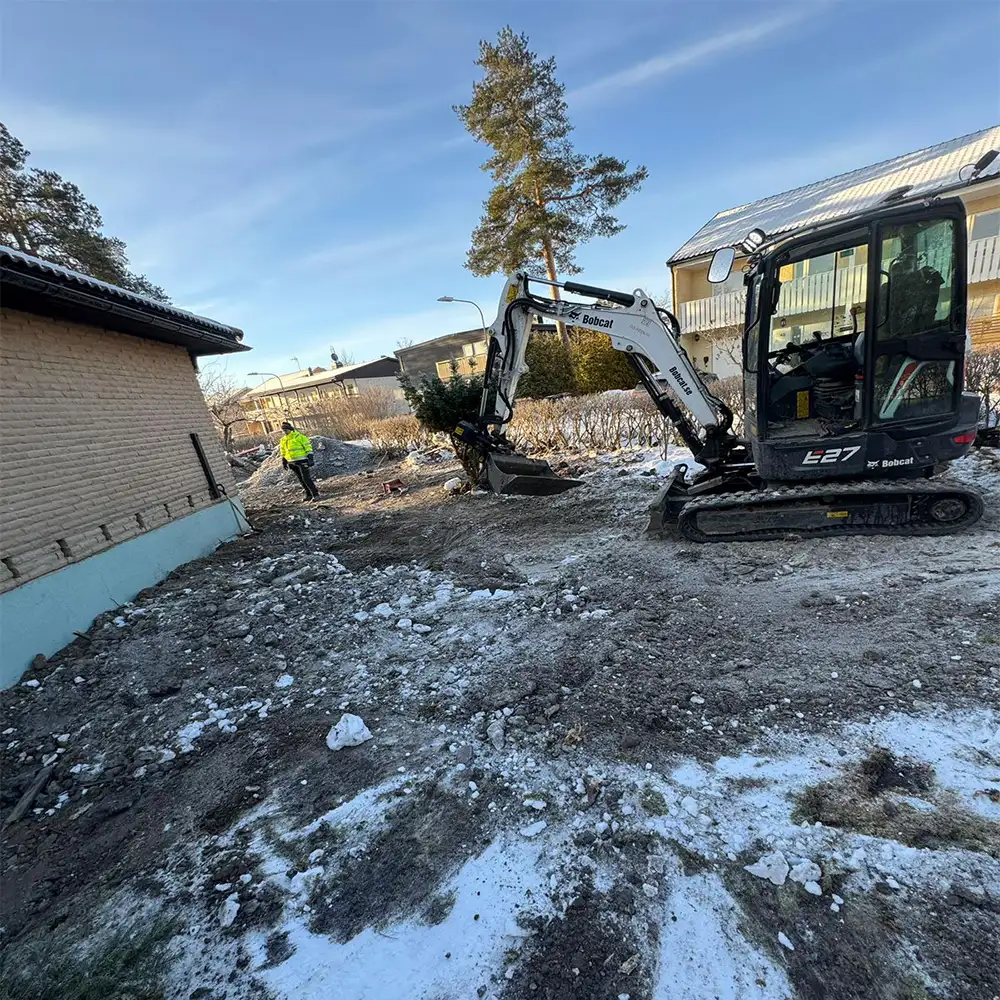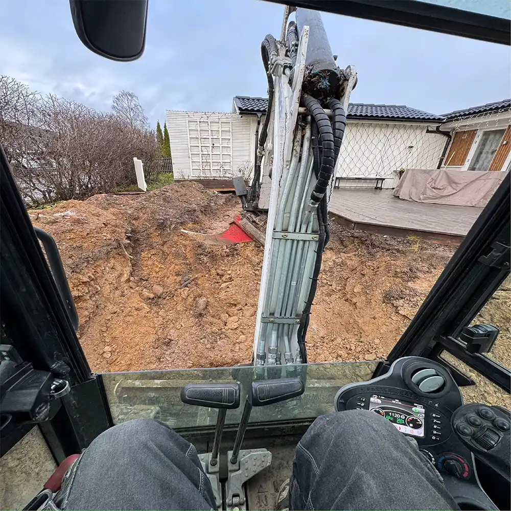 Vi börjar alltid med att förstå projektets mål. Därefter går vi igenom markförhållanden, nivåer, tillgänglighet för maskiner och vilka moment som behöver samordnas. När flera delar planeras tillsammans blir projektet både mer effektivt och tydligare. Ofta kan vi hjälpa till med hela kedjan – från första schakttaget till färdigställd yta.